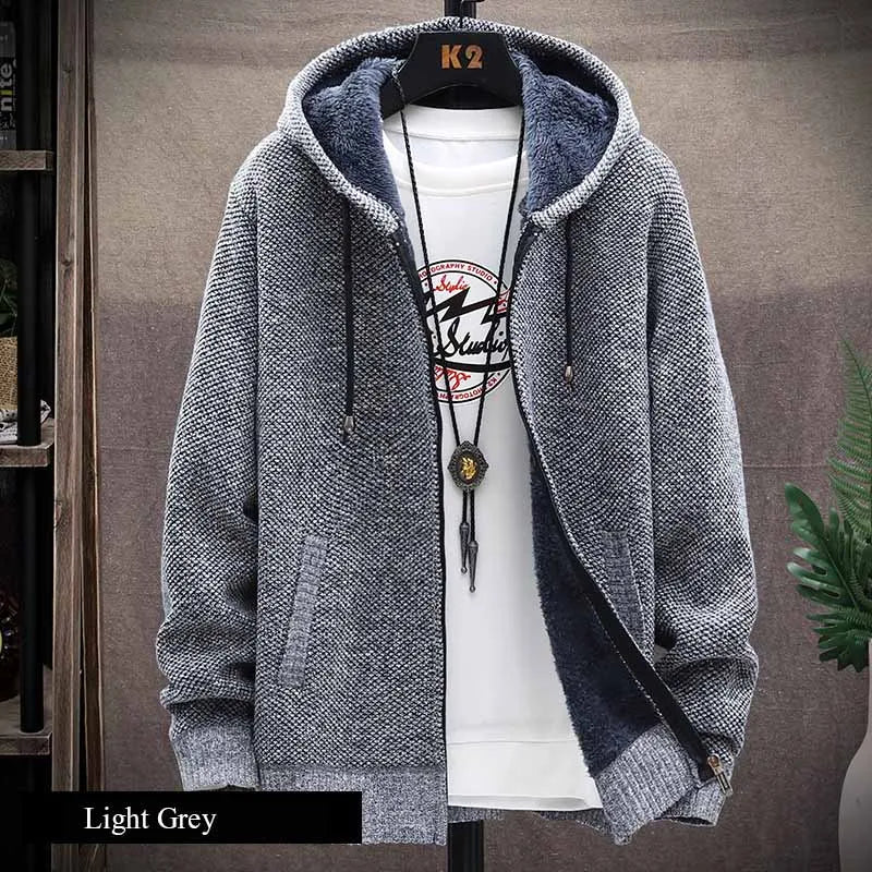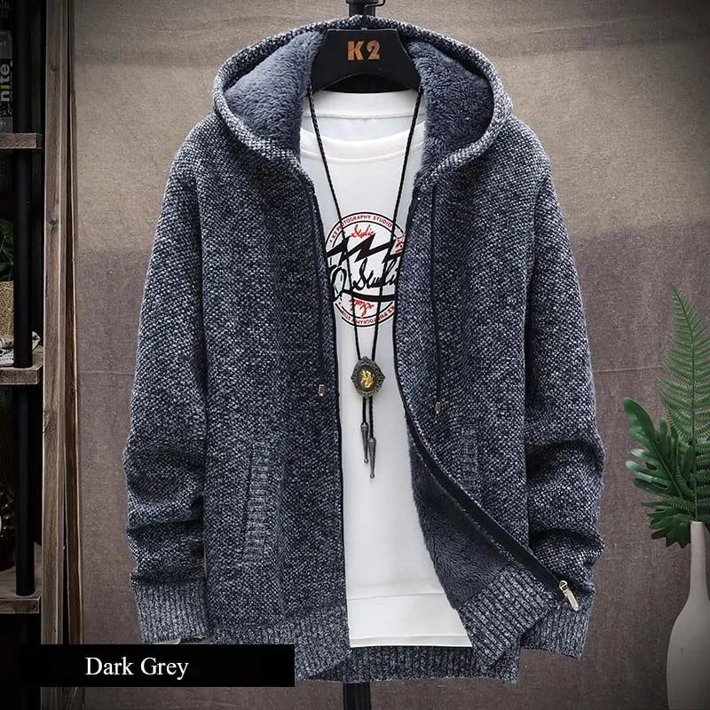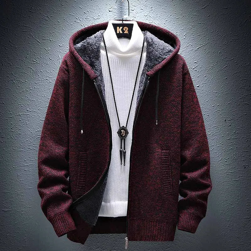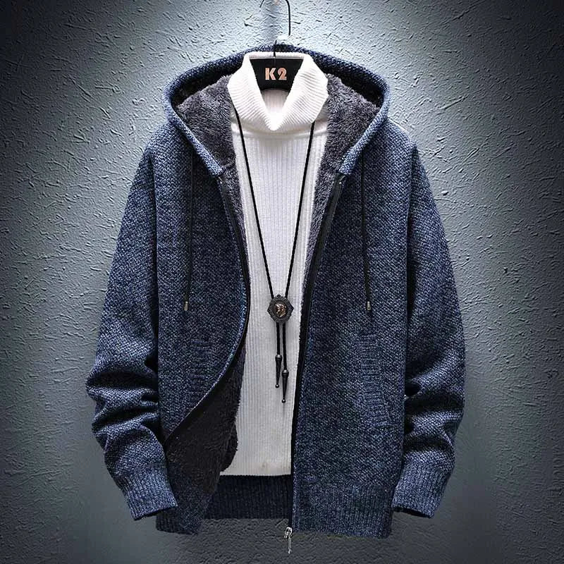 FALIZA Hooded Cardigan Knitted Sweater Mens Solid Color Thick Fleece Wool Casual Knitwear Male Clothing Sweaters for Men MXY117