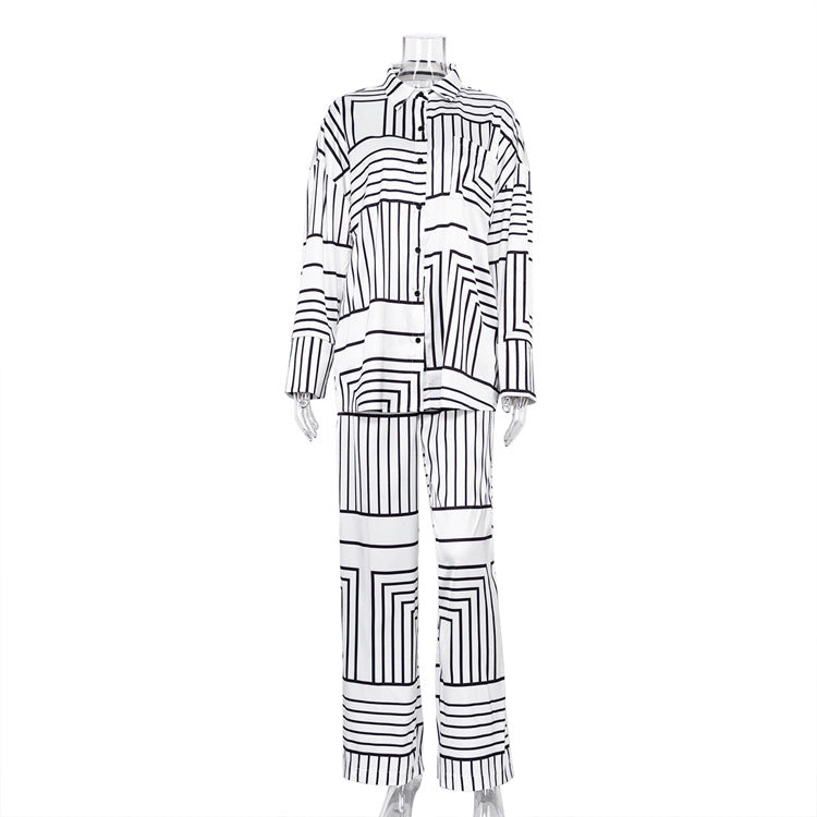 European And American Women's Satin Drape Print Shirt Two-piece Set