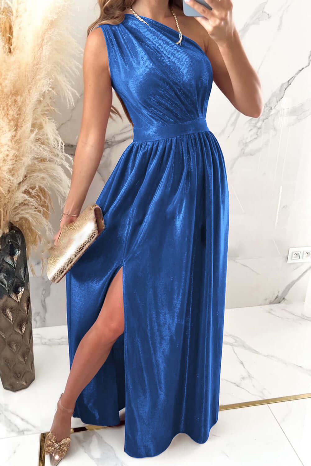 One Shoulder Slit Ruched Maxi Dress