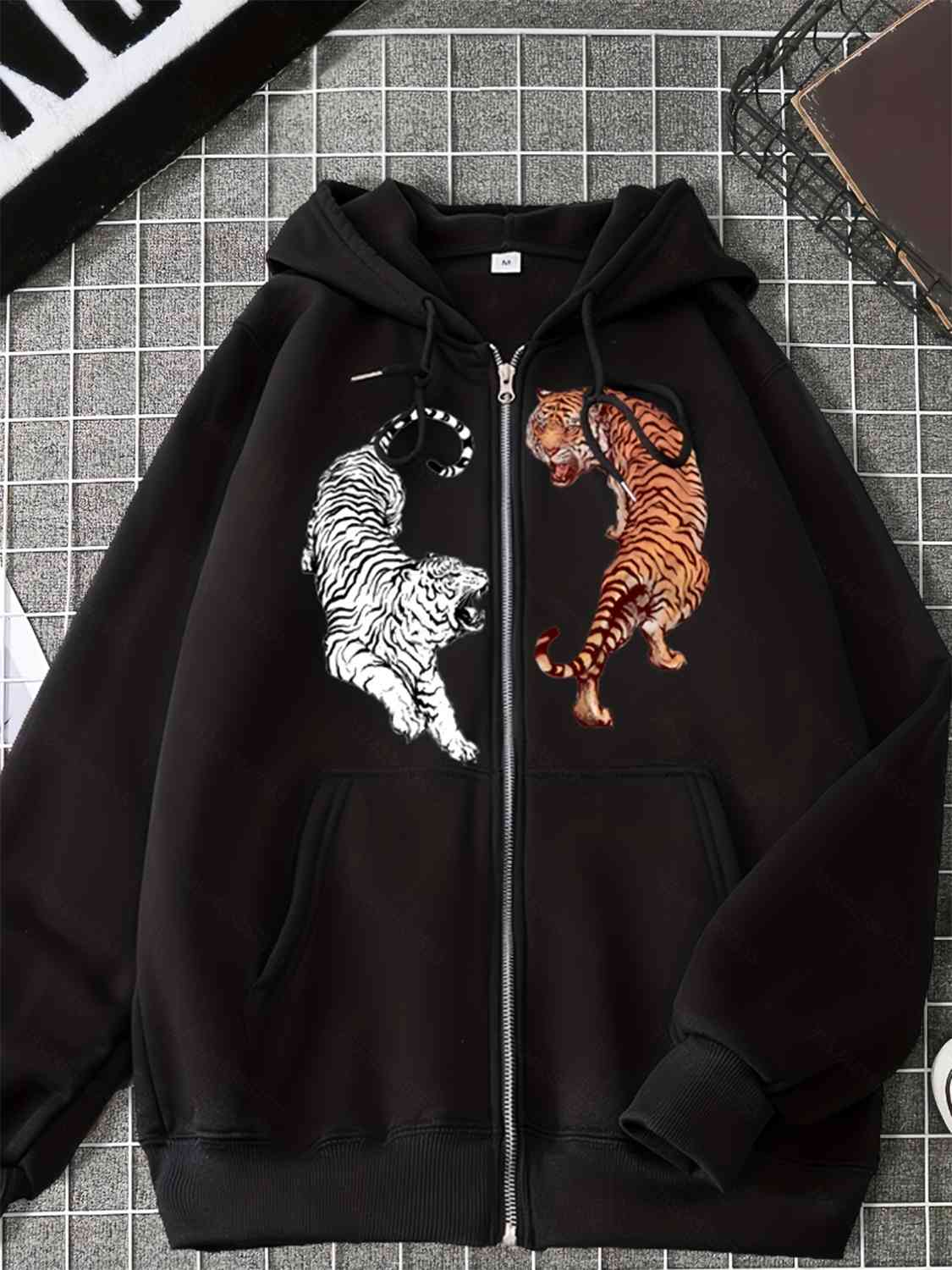 Tiger Graphic Zip Up Drawstring Hoodie with Pockets